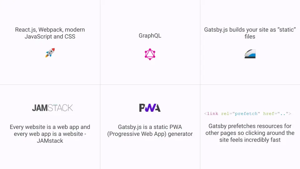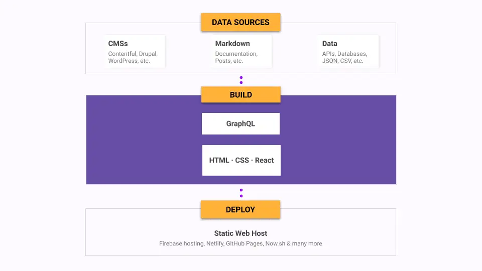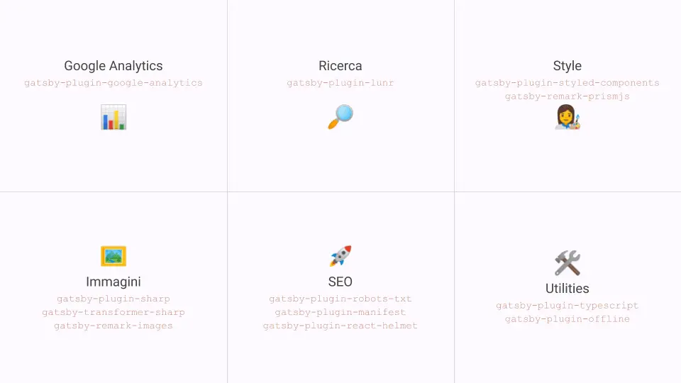 - GatsbyJS può leggere da una qualsiasi fonte di dati: CMS, file statici, API, Database, etc. Ci sono parecchi plugin che possono coprire qualsiasi necessità;